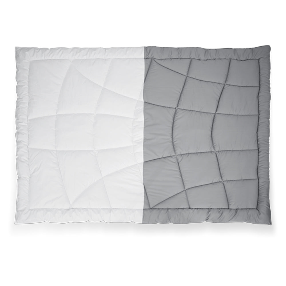 Each comforter contains a thermo-regulating feature on both sides. One half contains cooling elements, and the other half contains warming elements. This results in four different configurations: