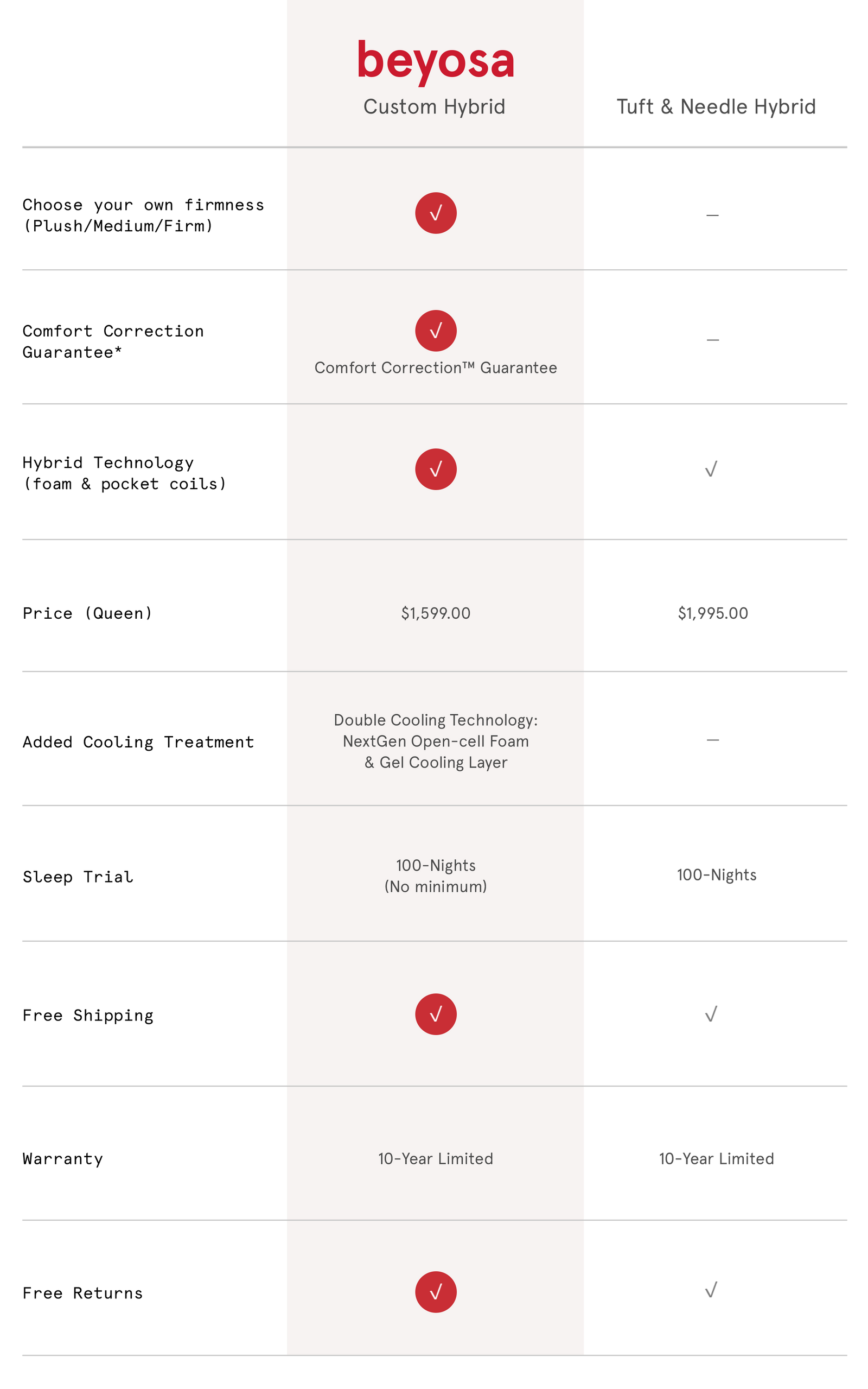 Tuft & Needle only offers a single-firmness hybrid mattress. Beyosa, on the other hand, allows you to customize the firmness of BOTH sides of the bed.