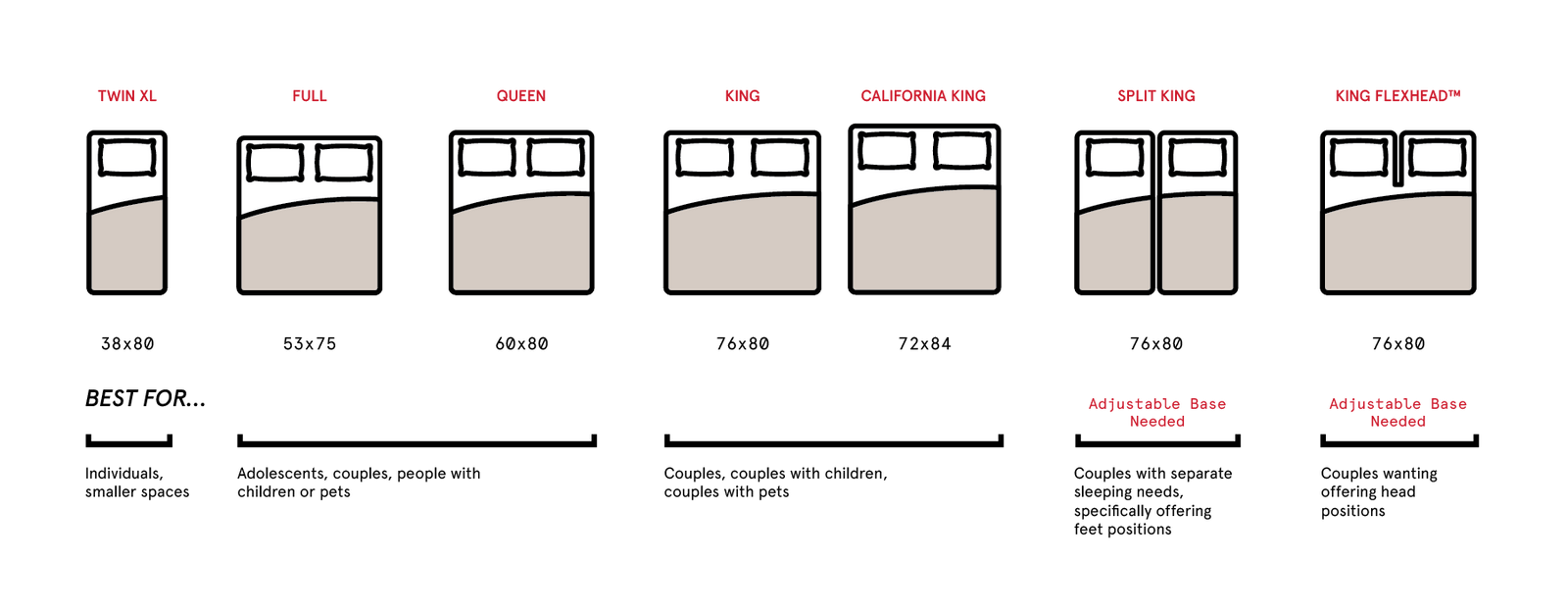 Queen, King, King FlexHead, King Split, Twin/XL, Full and California King.